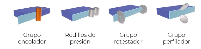 Nueva gama de maquinaria que está compuesta por encoladoras de cantos rectos unilaterales equipada con los siguientes grupos de trabajo: grupo encolador, rodillos de presión, retestador y perfilador.